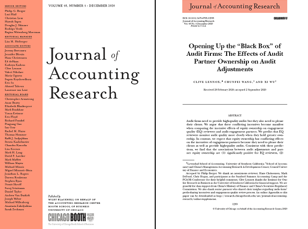Recently, the academic paperOpening up the “Black Box” of Audit Firms: The Effects of Audit Partner Ownership on Audit Adjustments, co-authored by our Accounting School Associate Professor Wang Chunfei, Professor Wu Xi and internationally renowned accounting scholar Professor Clive Lennox from University of Southern California, was published inJournal of Accounting Research(JAR), Vol 58, No. 5 (December 2020, pp. 1299-1341).(https://doi.org/10.1111/1475-679X.12333)