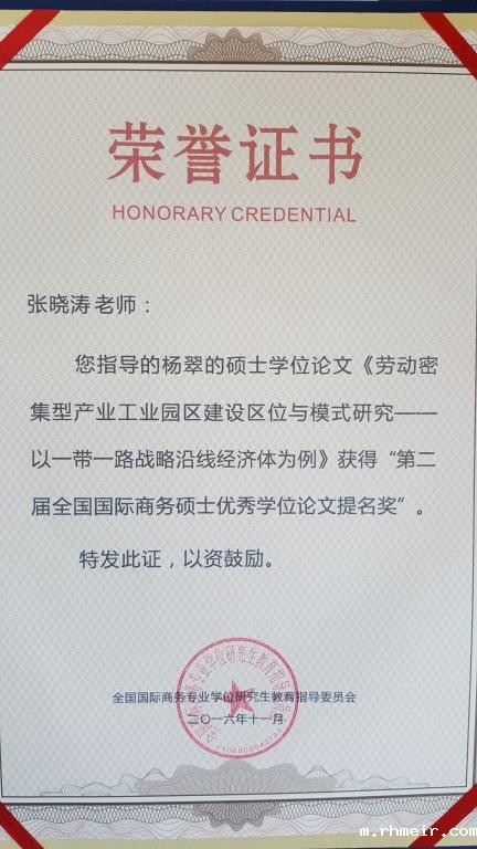 我院院长张晓涛教授指导的硕士研究生获得第二届全国国际商务硕士优秀学位论文提名奖 |