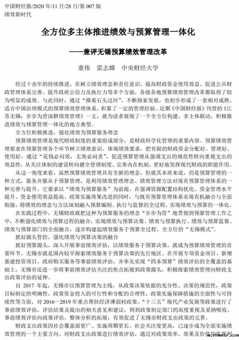 2020年11月28日,我院俄罗斯东欧中亚研究中心主任、伟德1946娱乐场绩效管理研究中心主任童伟研究员,在《中国财经报》“绩效新时代”版,发表文章《全方位主体推进绩效与预算管理一体化》。文章指出,经过十余年的持续推进,在树立绩效理念和责任意识、提高财政资金使用效益、促进公共财政管理体系完善、提升政府公信力及执行力等多个方面,各级各地预算绩效管理改革都取得了较为明显的成效。