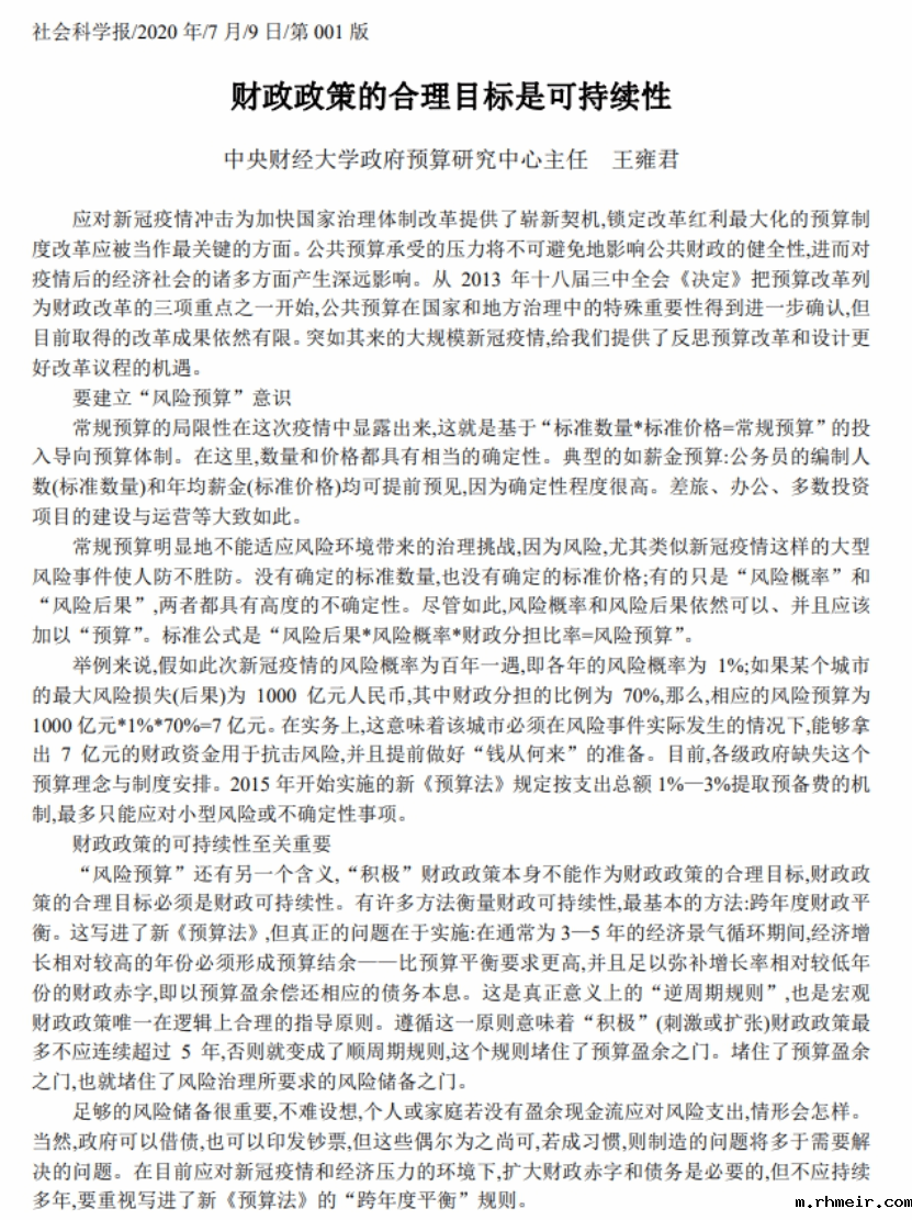 2020年7月9日,我院政府预算研究中心主任王雍君教授,在《社会科学报》,发表文章《财政政策的合理目标是可持续性》。文章指出:应对新冠疫情冲击为加快国家治理体制改革提供了崭新契机,锁定改革红利最大化的预算制度改革应被当作最关键的方面。公共预算承受的压力将不可避免地影响公共财政的健全性,进而对疫情后的经济社会的诸多方面产生深远影响。