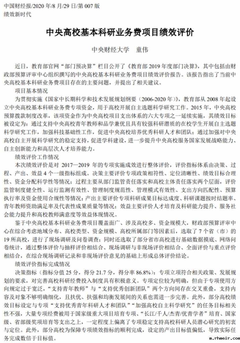2020年8月29日,我院俄罗斯东欧中亚研究中心主任、伟德1946娱乐场绩效管理研究中心主任童伟研究员,在《中国财经报》“绩效新时代”版,发表文章《中央高校基本科研业务费项目绩效评价》。文章指出了当前中央高校基本科研业务费项目管理存在的主要问题,并提出了改进与完善的建议。