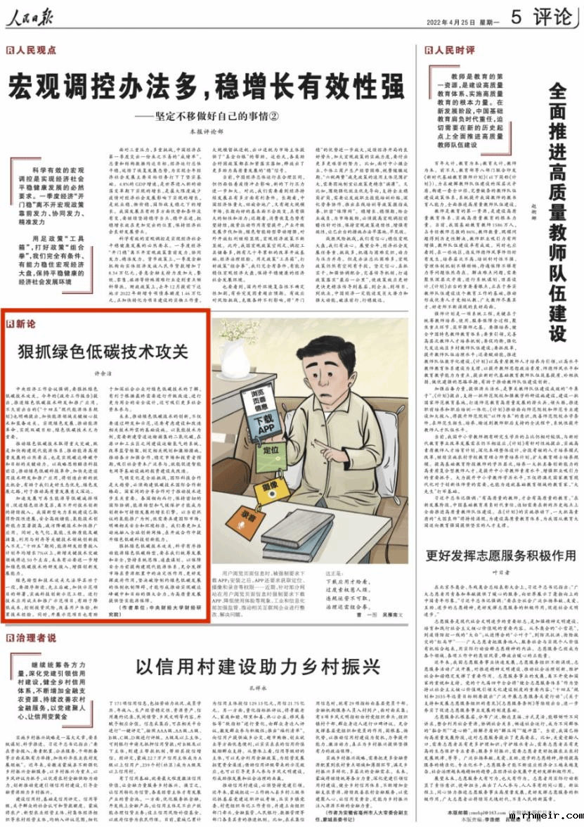 2022年4月25日,我院伟德1946娱乐场-北京银行 双碳与金融研究中心常务副主任许余洁在《人民日报》发表“狠抓绿色低碳技术攻关”一文。