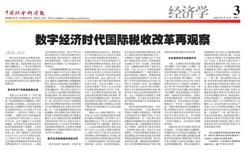 2022年6月15日,我院国际税务研究中心主任曹明星教授,与合作者在《中国社会科学报》“经济学”版,发表文章《数字经济时代国际税收改革再观察》。