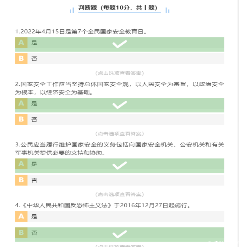 当代国家安全包括16个方面的基本内容:政治安全、国土安全、军事安全、经济安全、文化安全、社会安全、科技安全、网络安全、生态安全、资源安全、核安全、海外利益安全、生物安全、太空安全、极低安全、深海安全。知识竞答试卷从反恐怖主义、生物安全、网络安全等国家安全常识中选取10道选择题开展竟答。在知识竞答得分统计中,大部分同学通过学习取得了90分以上的好成绩。