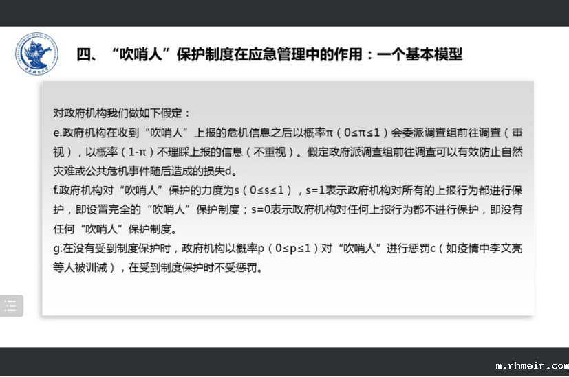 最后,基于研究分析,昌教授提出中国需要制定“吹哨人”保护制度的相关法律法规和相应的奖惩机制。需建立专门的举报审查机构,并加强宣传服务公众的思想理念等,进一步完善公共卫生应急管理体系。