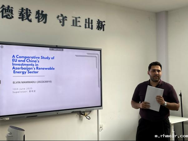 The Institute of Finance and Economics Research at the Central University of Finance and Economics (CUFE) successfully hosted a workshop titled "Comparative Study of EU and China’s Investments in Azerbaijan’s Renewable Energy Sector" on June 11, 2025. The event, held in Room 314 of the Tupei Building, featured a compelling presentation by Elvin Mammadli, who shared the latest findings from their research.
