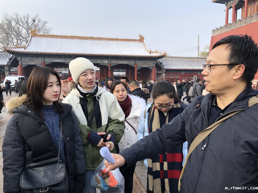北京故宫是中国明清两代的皇家宫殿,旧称紫禁城,位于北京中轴线的中心,是中国古代宫廷建筑之精华。北京故宫以三大殿为中心,占地面积72万平方米,建筑面积约15万平方米,有大小宫殿七十多座,房屋九千余间,是世界上现存规模最大、保存最为完整的木质结构古建筑之一。故宫宫殿沿着一条南北向中轴线排列,三大殿、后三宫、御花园都位于这条中轴线上,并向两旁展开,南北取直,左右对称。我院师生从正阳门进入,沿着故宫中轴线依次参观经过天安门、端门、午门、太和殿、乾清宫、御花园及神武门等著名历史遗迹,同时参观了金银馆和珠宝馆等珍贵文物。在参观过程中,郝秉键老师全程给同学们普及故宫历史常识和讲解著名典故,通过介绍三交六椀菱花图案的象征、屋脊上仙人走兽的寓意、御门听政的由来、文华门的用途、军机处的历史变革以及文渊阁的历史意义等故宫知识,使大家更深入地了解了中国明清时期的历史,加深了对课堂知识的理解,也在各个故事中感受到了中华历史的发展和变迁。