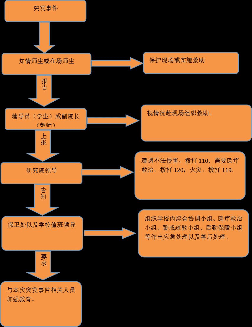 对于各类突发事件,事件第一发现人应迅速判断事件性质,根据事件性质,及时向科室负责人及院领导报告;学生需第一时间向辅导员、研究院领导报告;研究院按照要求,及时向学校相关部门上报。当事人可根据事件性质及时向社会、政府各救治排险机构求救。特定突发事件,学校有规定的,按照学校规定执行。