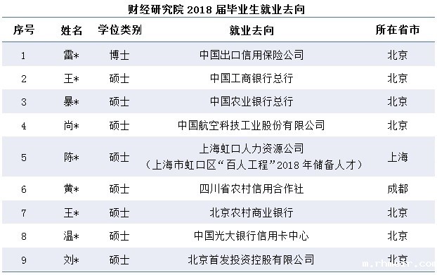 2018年,伟德网址下载app共有应届毕业生9名,博士生1名和硕士生8名。本届毕业生求职过程顺利,大多数已在秋季学期签订三方协议。截至目前,已全部落实工作去向,就业率达100%,其中签约单位包括中国工商银行总行、中国农业银行总行和中国出口信用保险公司等大型金融机构等,就业地点分布在北京、上海和成都三个主要城市。