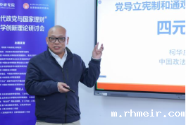 中国政法大学教授柯华庆以“党导立法与通观经济学中的哲学四元论”为题,阐述了其创新的四元论哲学,该理论超越传统哲学思维,将实体、关系和时间作为基本要素,为理解中国特色社会主义市场经济提供了新的视角,强调了关系和时间在社会现象中的重要性。