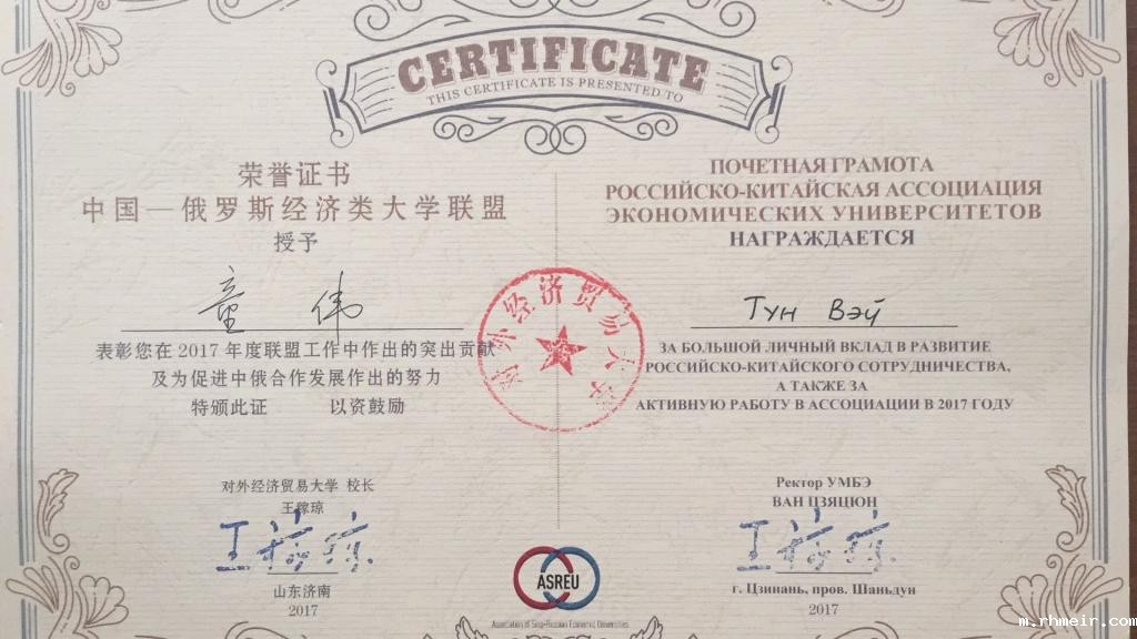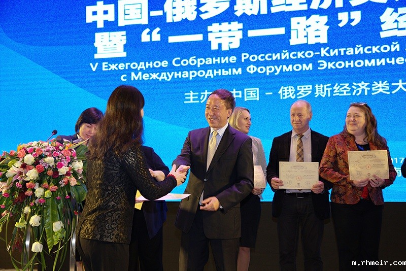 俄罗斯联邦驻华大使馆大使杰尼索夫向大会发来贺信,认为中俄高校在落实联盟各项任务中起了重要作用,期望在学生交换和共同培养毕业生方面有新的合作,期待中俄双方继续巩固经贸关系,加强金融合作;并祝年会和经济论坛取得丰硕成果。会上,对外经济贸易大学副校长赵忠秀、俄罗斯太平洋国立大学第一副校长祖巴列夫就中俄经济类大学联盟的意义、中俄交流项目、“一带一路”合作规划等进行了阐述,并为对联盟工作做出突出贡献的优秀个人颁发了荣誉证书。