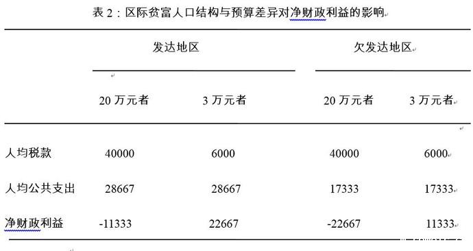 由表2可知:所有个人不论其收入多少,在发达地区得到的净财政利益均高于欠发达地区(11334元),因而存在一个从欠发达地区流向发达地区的倾向。一般结论是:只要地方政府预算具有累进性(穷人的净财政利益高于富人),财政原因必定导致欠发达地区向发达地区的移民从而使后者拥有较多人口。