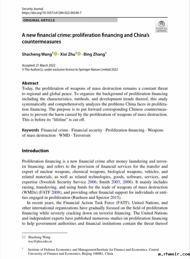 SSCI期刊Security Journal于2022年4月8日在线发表我院王沙骋副教授及其研究生祝茜茜和张冰的金融反恐最新研究成果“A new financial crime: proliferation financing and China's countermeasures”。
