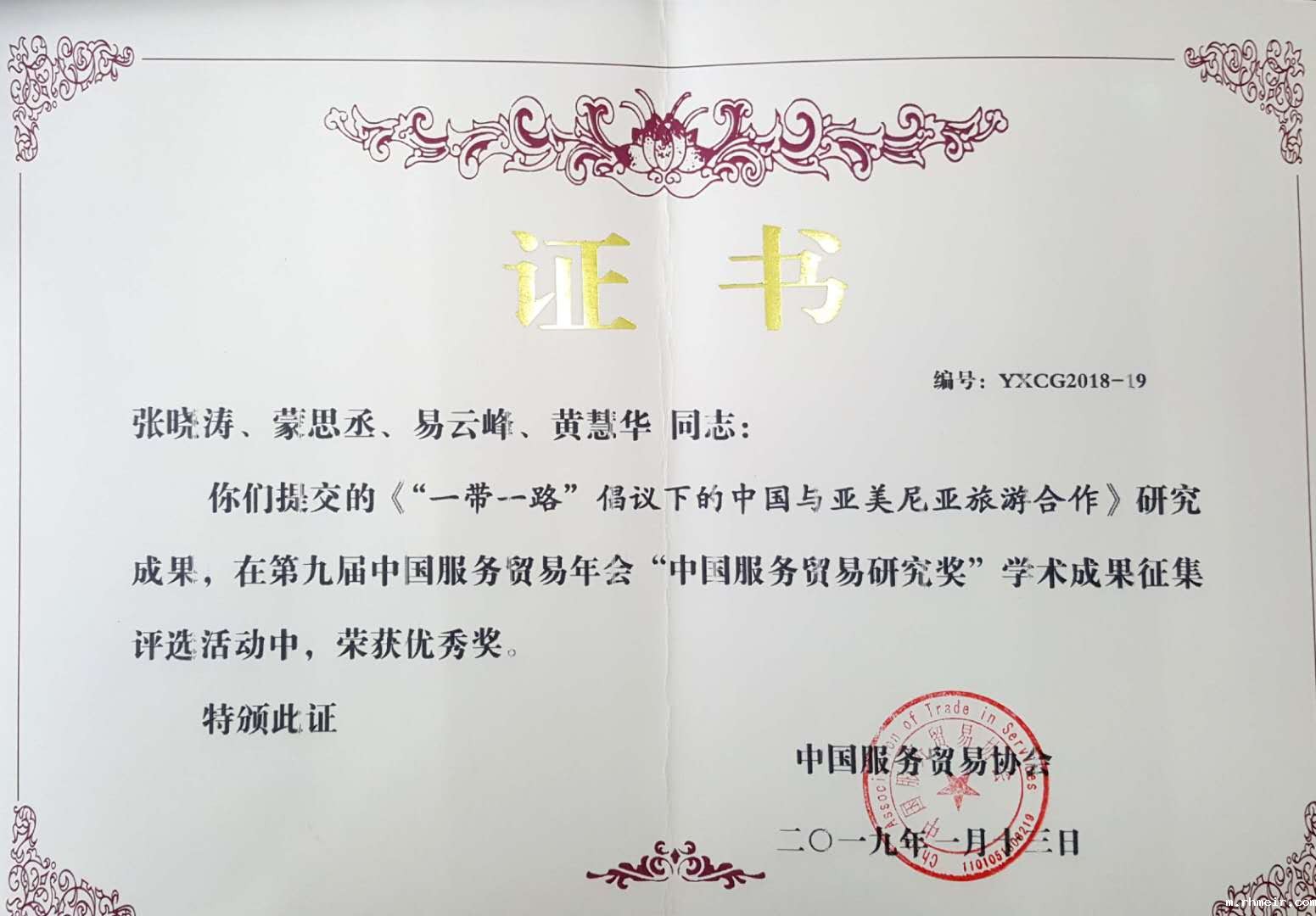 张晓涛教授及其合作者(蒙思丞、易云锋、黄慧华)的论文《“一带一路”倡议下的中国与亚美尼亚旅游合作》获得第九届中国服务贸易年会“中国服务贸易研究奖”优秀成果奖。该成果是张晓涛教授团队在“一带一路”经贸与投资合作领域的系列成果之一。