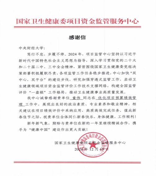 国家卫生健康委项目资金监管服务中心的感谢信指出,2024年,绩效管理研究中心作为重要合作单位,高质量参与了优化项目预算绩效管理的相关工作,期待新的一年继续与我校绩效管理研究中心开展精诚合作,携手为“健康中国”建设作出更大贡献。