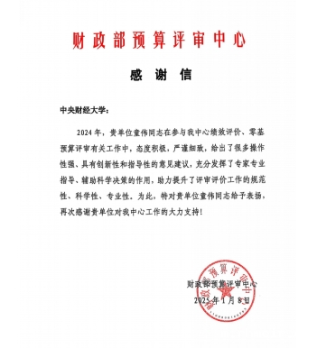 财政部预算评审中心的感谢信对童伟研究员给予了充分表扬,在参与绩效评价、零基预算评审有关工作中,童伟研究员充分发挥了专家专业指导、辅助科学决策的作用,助力提升了评审评价工作的规范性、科学性、专业性特。同时,教育部经费监管事务中心对我校绩效管理研究中心的大力支持表示了衷心感谢。