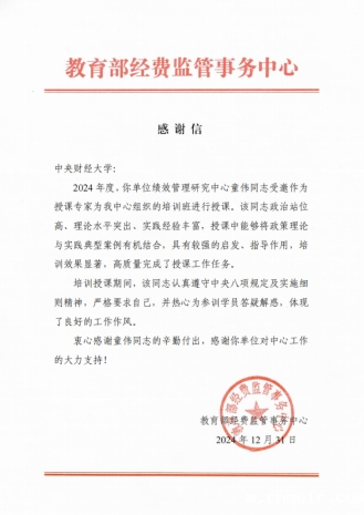 近日,我校收到国家卫生健康委项目资金监管服务中心、教育部经费监管事务中心以及财政部预算评审中心的感谢信,对绩效管理研究中心主任童伟研究员表示了衷心的感谢。在过去的一年,童伟研究员在优化项目预算绩效管理、开展预算绩效管理咨询与培训、参与预算绩效管理和零基预算改革等方面,发挥了专业优势,提供了专业指导和技术支持。
