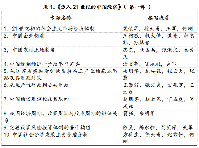 王柯敬(时任伟德1946娱乐场校长)为第一辑主编,召集主题讨论。主题的设置主要围绕世纪初我国社会主义市场经济体制、企业制度、农村土地制度、财政税收制度、宏观调控政策取向、风险投资体制等一系列主题,结合江苏省经济社会快速发展中的实践经验,对我国经济制度、政策的历史沿革进行了梳理,并对未来改革方向与亟待完善的方面进行了总结(见表1)。