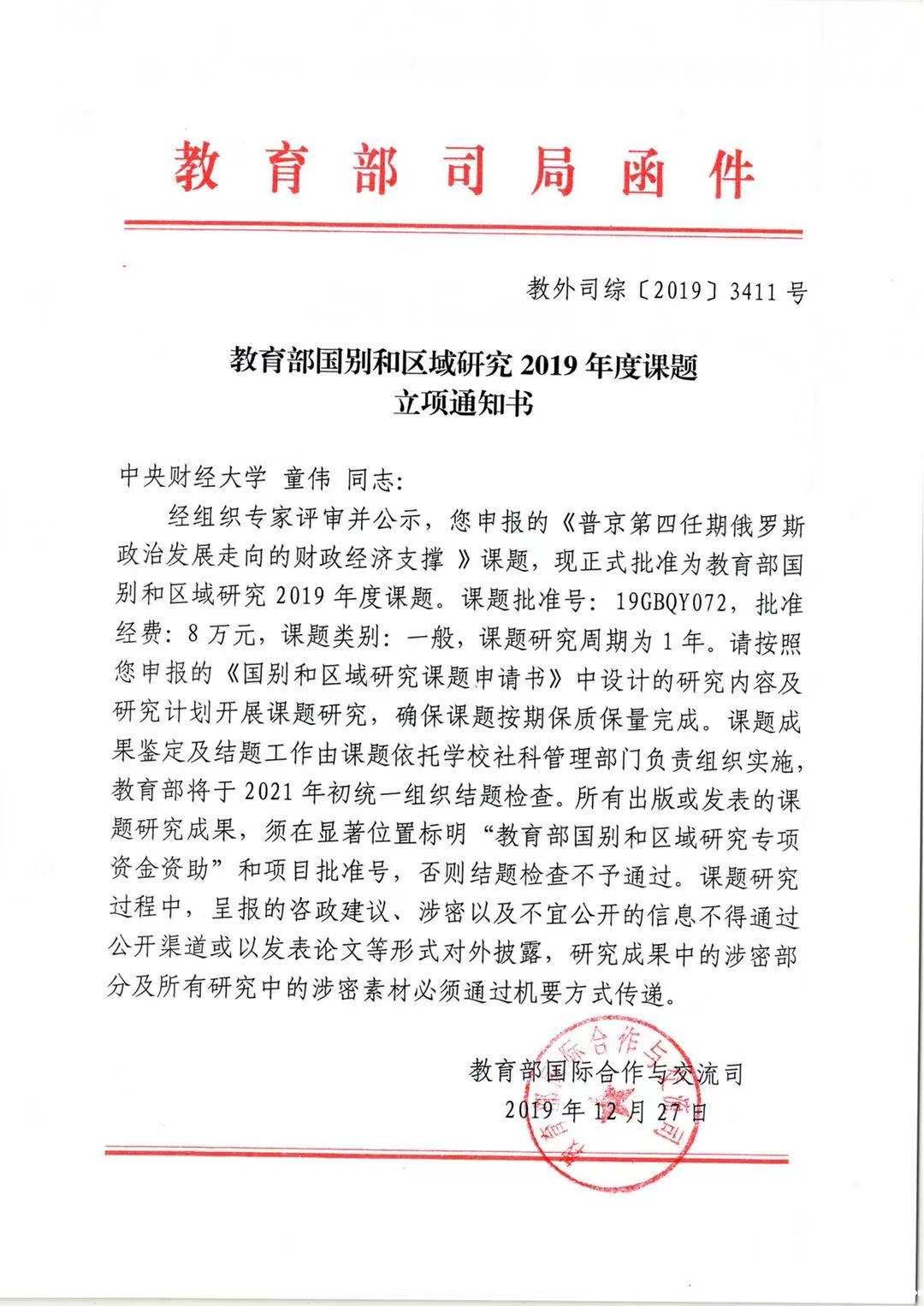 我院童伟研究员课题《普京第四任期俄罗斯政治发展走向的财政经济支撑》批准为教育部国别和区域研究2019年度课题。