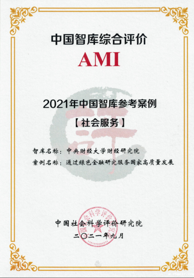 9月底,在中国社会科学评价研究院权威发布的《中国智库AMI综合评价研究报告(2021)》中,我院入选中国智库综合评价AMI“2021年中国智库参考案例”(案例名称:通过绿色金融研究服务国家高质量发展)。