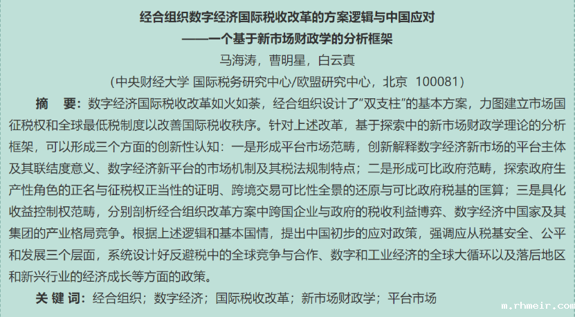 2022年第1期《当代财经》推介发表我院曹明星老师作为通讯作者撰写的探讨国际税改财政学基础问题的学术长文“经合组织数字经济国际税收改革的方案逻辑与中国应对 ——一个基于新市场财政学的分析框架(马海涛、曹明星、白云真)” 。
