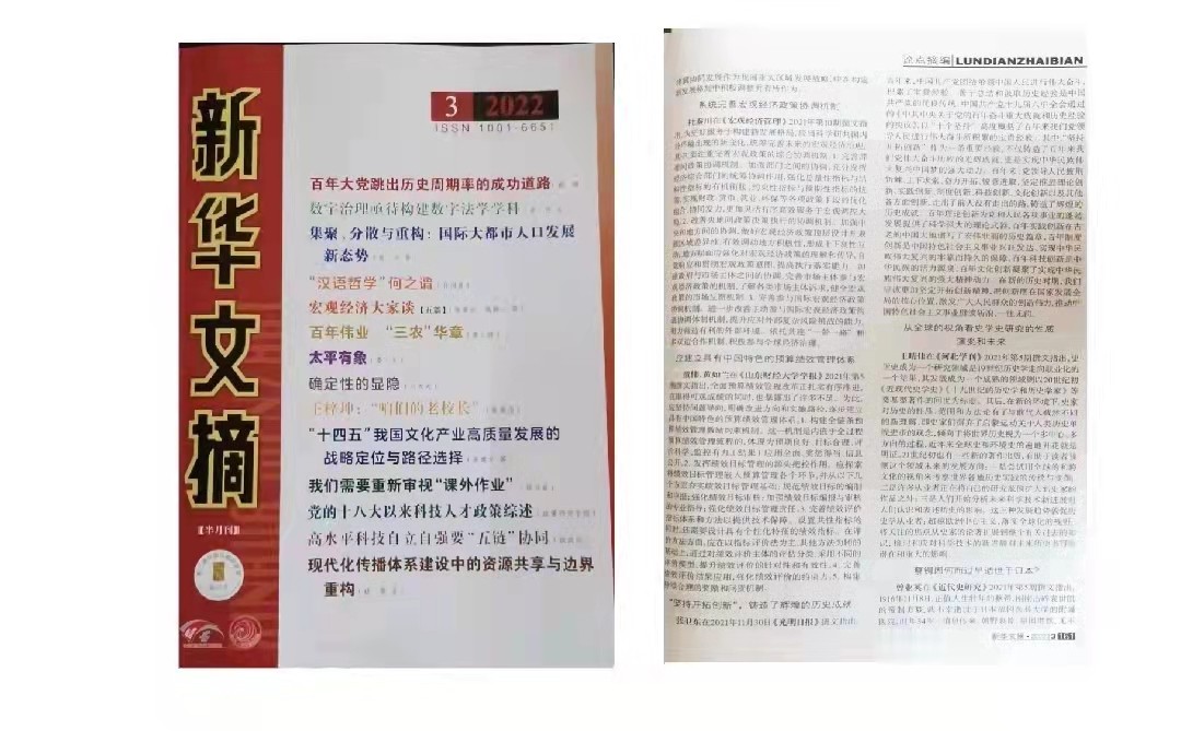 《新华文摘》作为我国大型理论性、综合性、资料性文摘类权威期刊,是我国最具影响的哲学社会科学文摘类杂志,也是目前国内哲学社会科学领域最权威的二次文献转载期刊。
