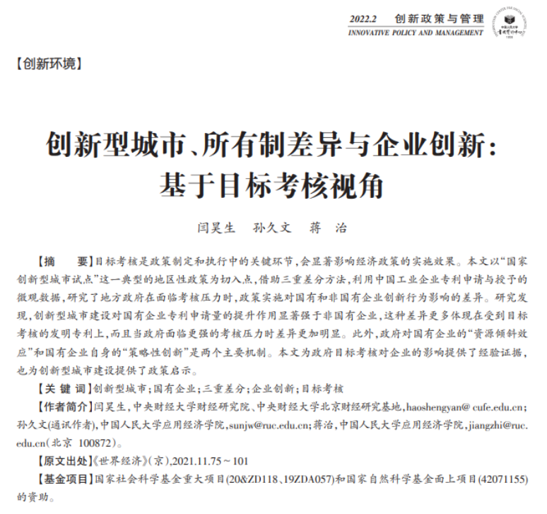 我院闫昊生博士后与合作者在《世界经济》2021年11期发表的论文《创新型城市、所有制差异与企业创新:基于目标考核视角》,被人大复印报刊资料《创新政策与管理》(2022年第2期)全文转载。
