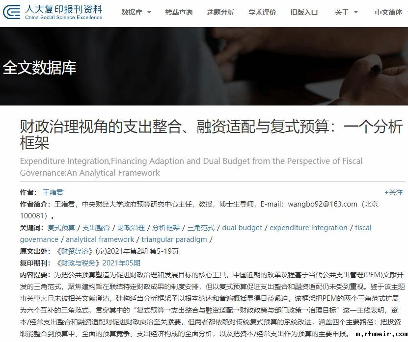 我院王雍君教授在《财贸经济》2021年第2期发表的论文《财政治理视角的支出整合、融资适配与复式预算:一个分析框架》,被人大复印报刊资料《财政与税务》(2021年第5期)全文转载。截止到目前,王雍君教授共有23篇学术论文被人大复印报刊资料全文转载。