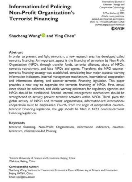2023年4月13日,SSCI期刊International Journal of Offender Therapy and Comparative Criminology在线发表我院王沙骋副教授的金融反恐论文Information-led Policing: Non-Profit Organization’s Terrorist Financing。该期刊5年影响因子为1.914,论文合作者为德勤陈颖。论文中文名称为《情报主导警务:非营利组织的恐怖融资》,论文永久链接为:https://doi.org/10.1177/0306624X231165428。