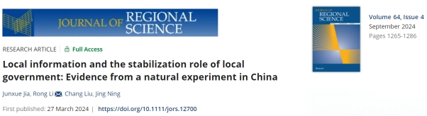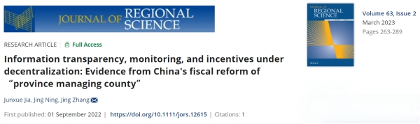 我院宁静副研究员作为共同第一作者,与合作者在SSCI期刊《Journal of Regional Science》(2023年影响因子3.2,JCR一区)连续两年发表关于“信息与省以下地方政府行为”主题的系列学术论文。《Journal of Regional Science》是区域经济研究和地理规划领域中最受学术界关注的期刊之一。