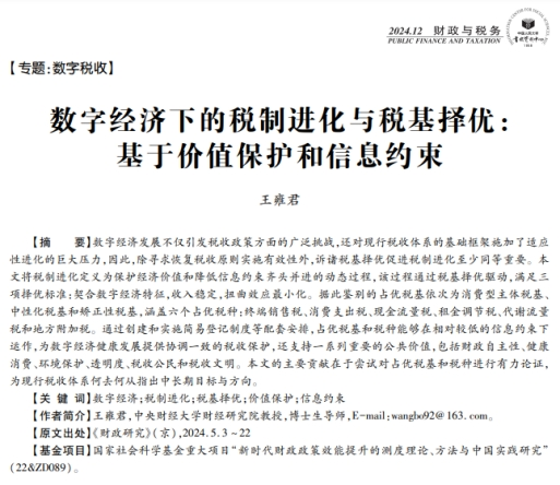 我院王雍君教授在《财政研究》2024年第5期发表的学术论文《数字经济下的税制进化与税基择优:基于价值保护和信息约束》,被人大复印报刊资料《财政与税务》(2024年第12期)全文转载。截止到目前,王雍君教授共有26篇学术论文被人大复印报刊资料全文转载。