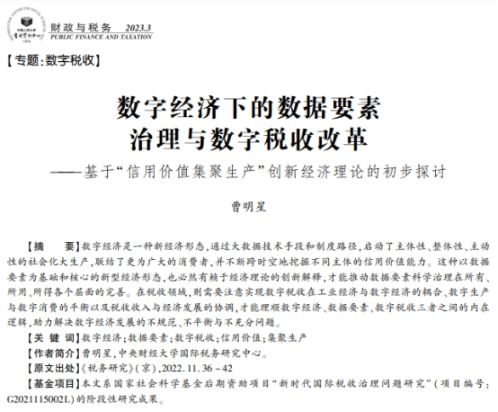 我院曹明星教授在《税务研究》2022年第5期发表的学术论文《数字经济下的数据要素治理与数字税收改革———基于“信用价值集聚生产”创新经济理论的初步探讨》,被人大复印报刊资料《财政与税务》(2023年第3期)全文转载。